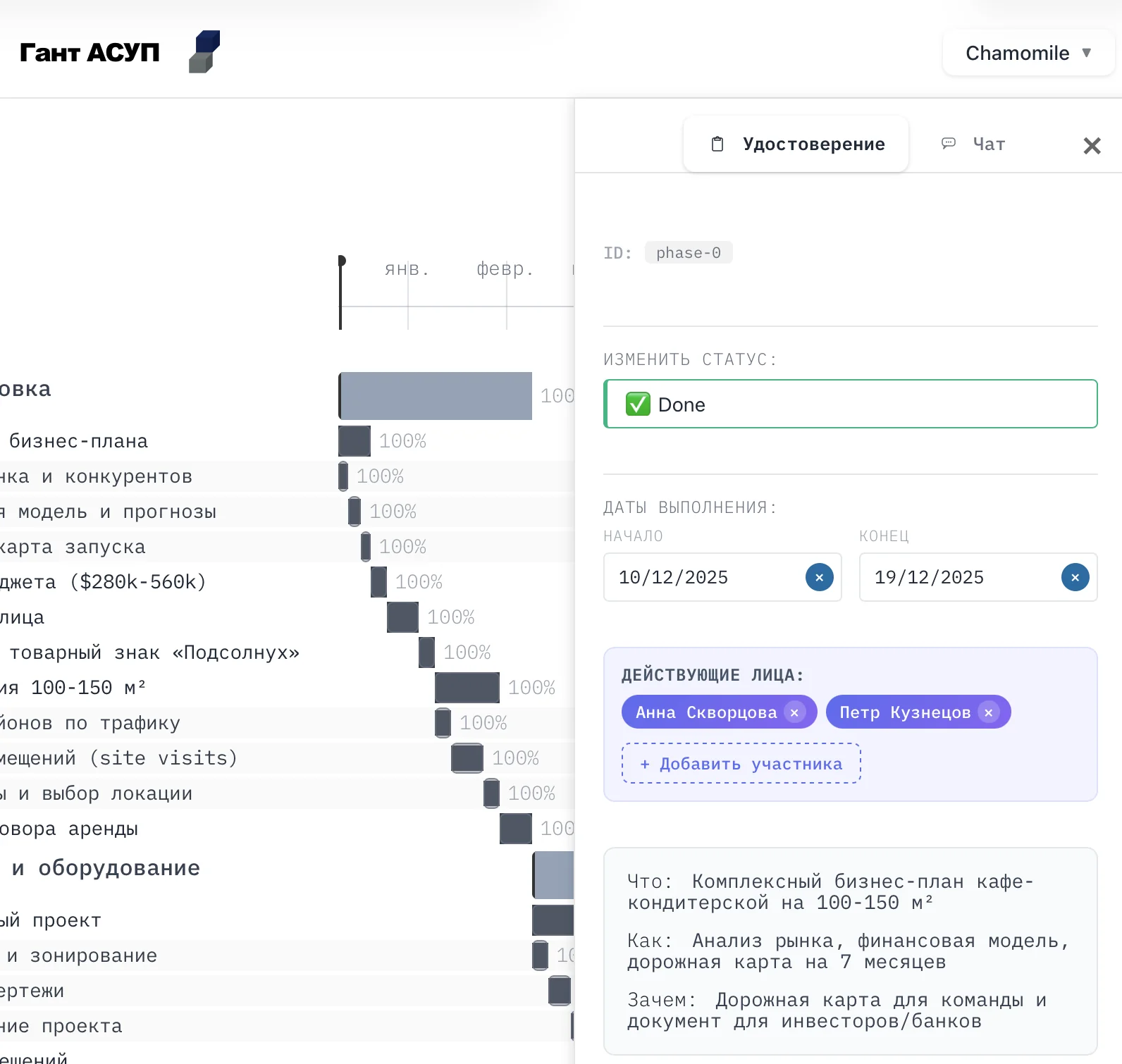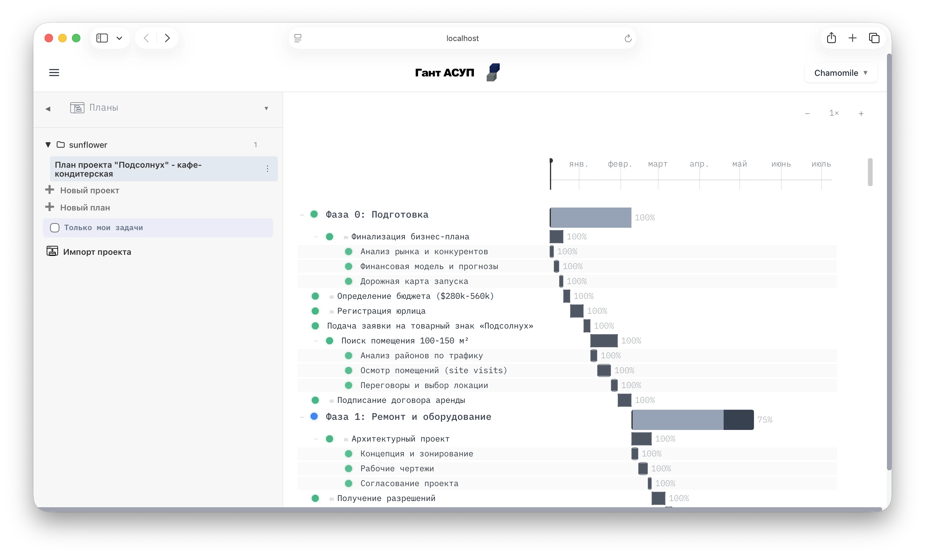 Интерактивные диаграммы Ганта, дашборды с метриками прогресса в реальном времени.