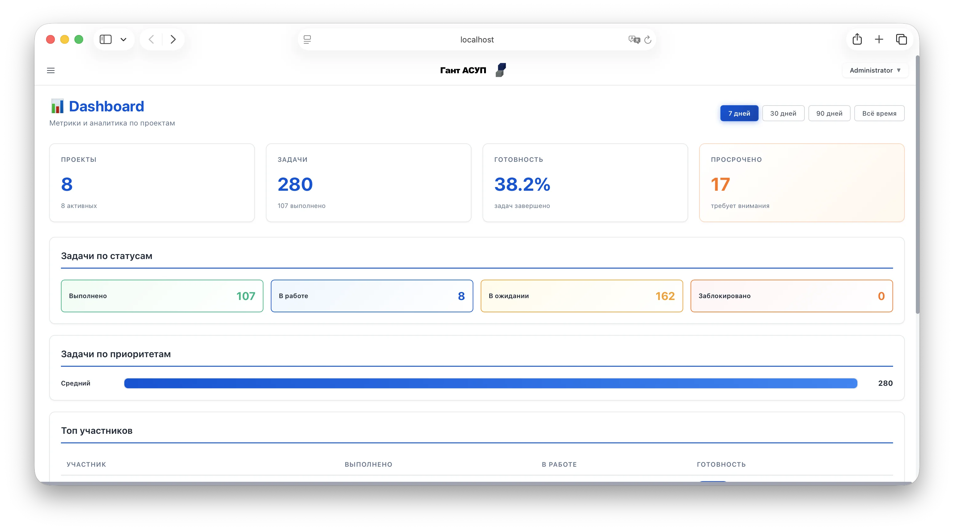 Dashboard с агрегированными метриками проектов: overview карточки (проекты, задачи, готовность, просрочено), распределение по статусам и приоритетам, таблица топ-участников с показателями эффективности и фильтрацией по временным диапазонам (7/30/90 дней, всё время)