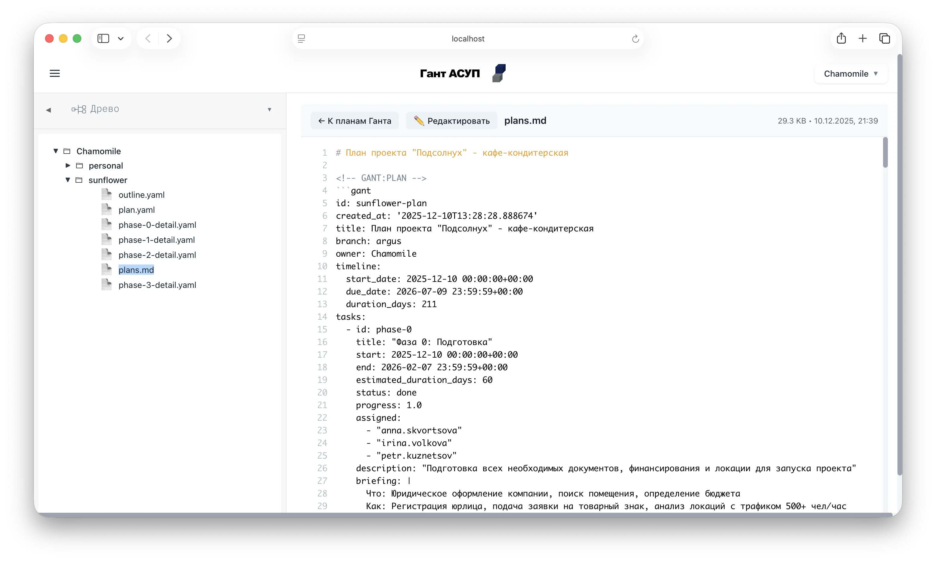 Двухпанельный интерфейс управления проектными артефактами: иерархический навигатор с ленивой загрузкой вложенных структур (древо каталогов с изоляцией пользователей) и встроенный YAML-редактор для просмотра и модификации файлов планирования с подсветкой синтаксиса и метаданными (размер, дата изменения)