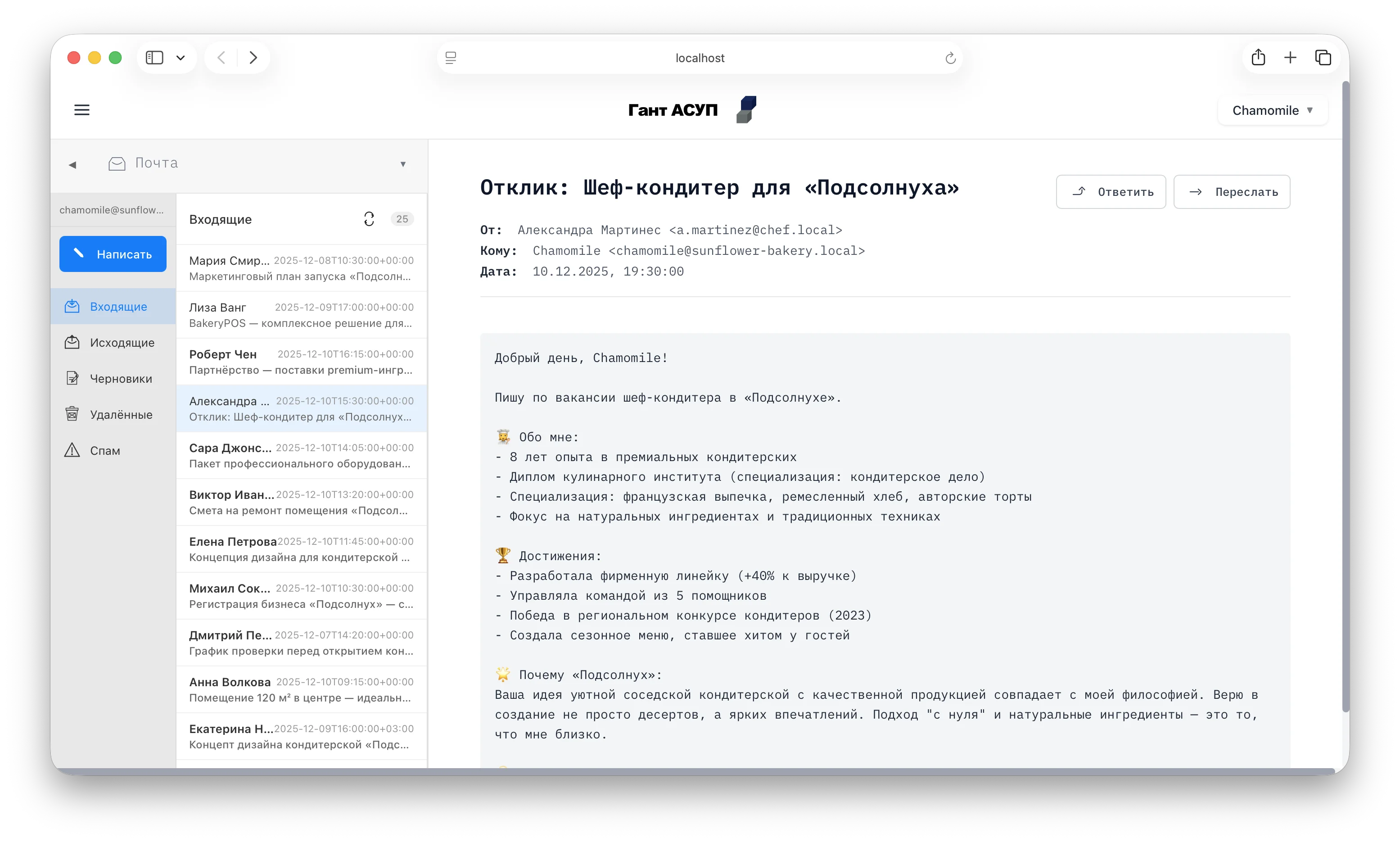 Встроенный email-модуль с двухпанельным интерфейсом: иерархическое дерево папок (Входящие, Отправленные, Черновики), список сообщений с метаданными и полнофункциональный просмотрщик с поддержкой создания, ответа и пересылки писем